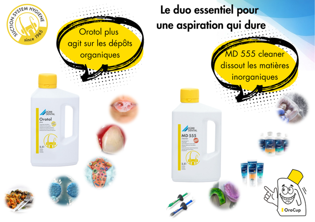 Votre système d’aspiration joue un rôle essentiel dans la gestion des aérosols et l’hygiène globale du cabinet. Son entretien régulier est donc indispensable. Orotol® Plus s’utilise quotidiennement pour assurer la désinfection et la désodorisation du système d’aspiration. Pour un entretien en profondeur, MD 555 Cleaner est recommandé deux fois par semaine afin d’éliminer les dépôts et maintenir des performances optimales.