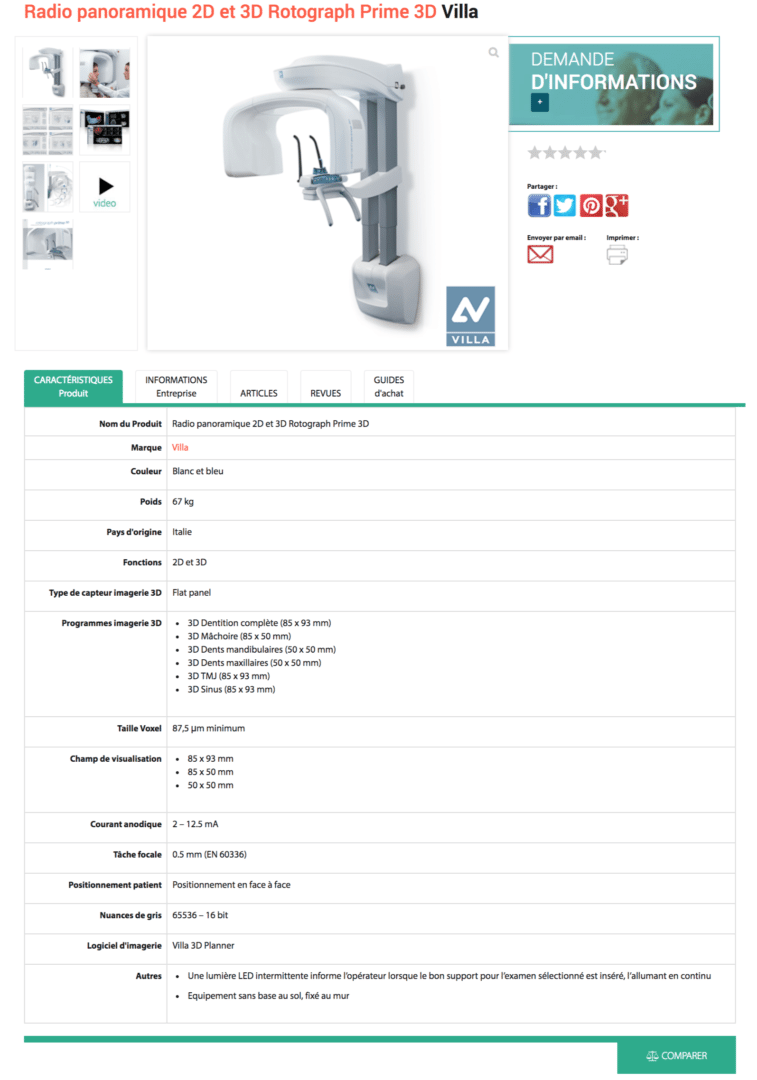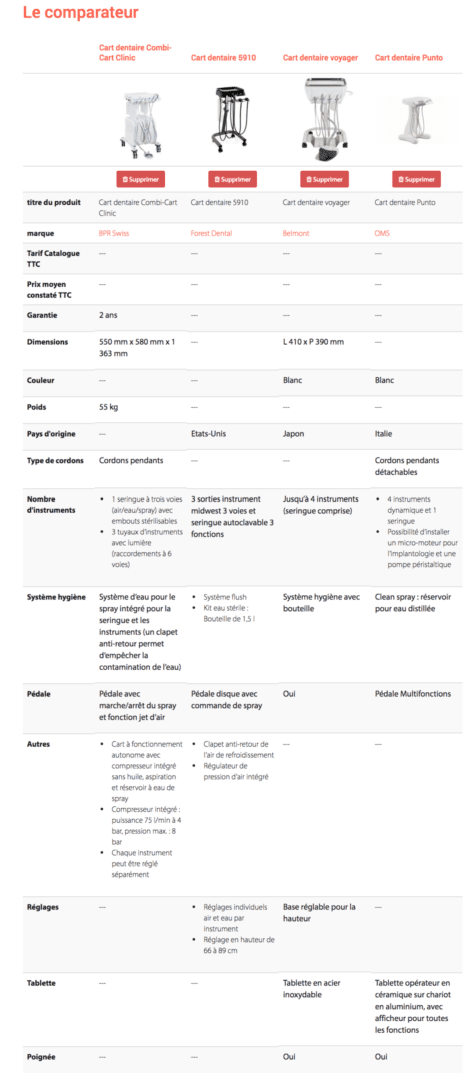 Cette présentation sous la forme de fiche produit, permet une comparaison aisée entre les équipements. L’équipe de Dynamique Dentaire a développé un comparateur, unique dans notre profession, pour vous permettre de comparer, des produits, d’une même catégorie, en seulement quelques clics !
