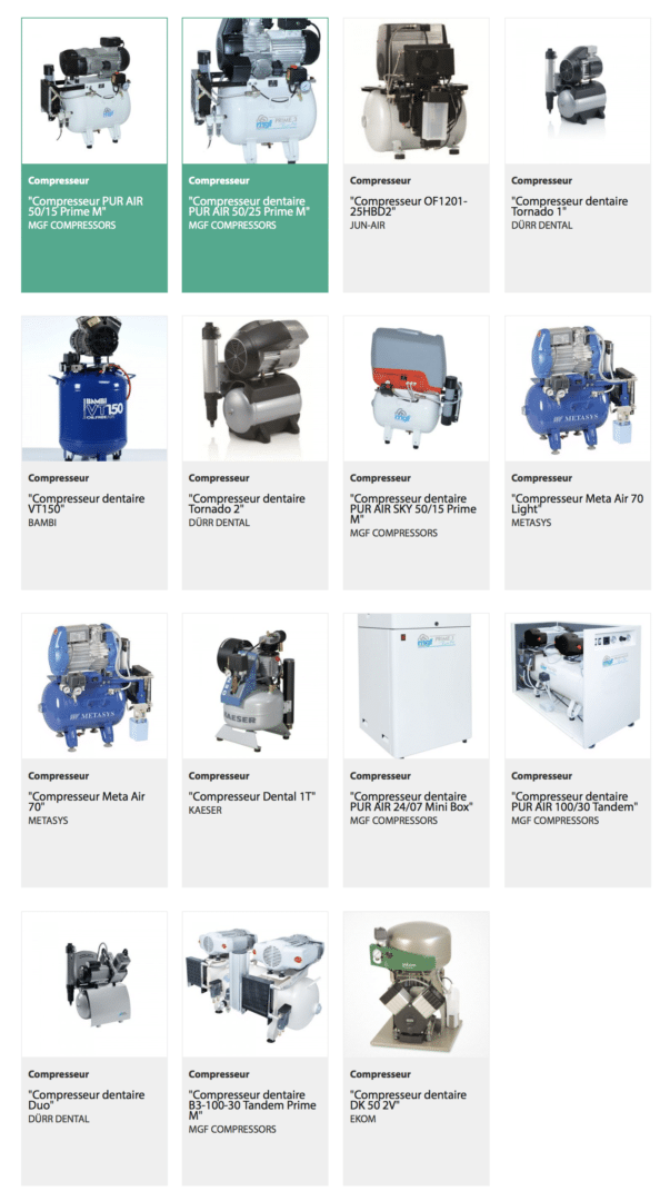 A ce propos, Dynamique Dentaire met à votre disposition des fiches techniques sur les principaux modèles de compresseur vendus sur le marché dentaire. En quelques clics, vous avez la possibilité de comparer jusqu’à 4 machines grâce à notre comparateur.