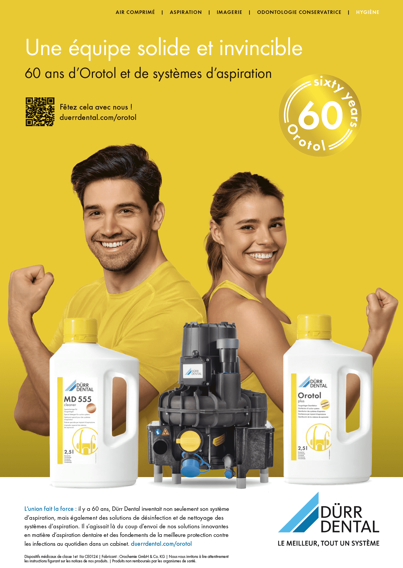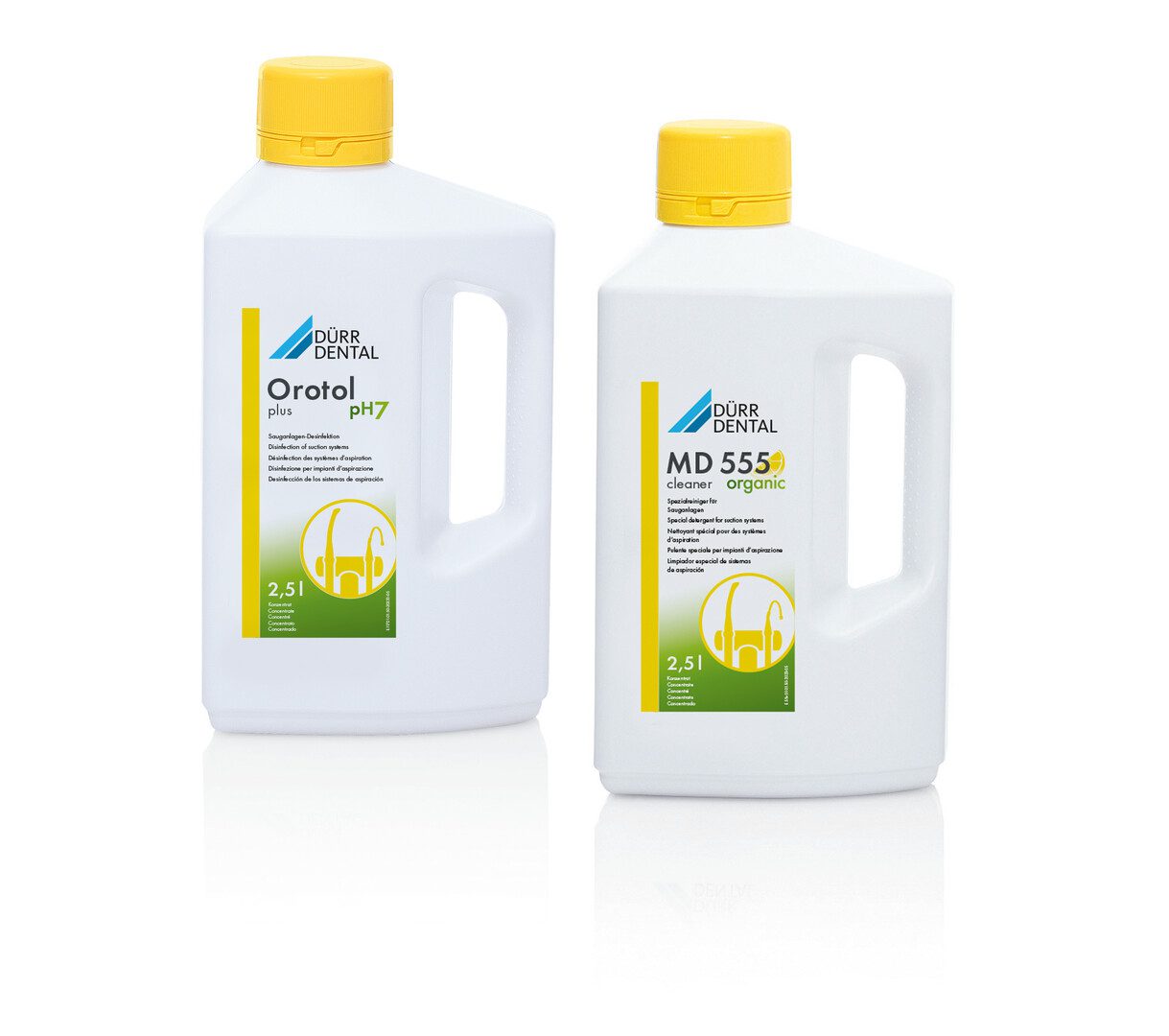 Pour répondre aux attentes croissantes des cabinets soucieux de durabilité, la gamme s’est enrichie de deux produits innovants destinés à la désinfection et au nettoyage des systèmes d’aspiration : Orotol plus pH 7 et MD 555 cleaner organic. Formulés à base de substances actives naturelles, à pH neutre et hautement biodégradables, ces produits garantissent une hygiène irréprochable tout en préservant la santé des utilisateurs et l’environnement.