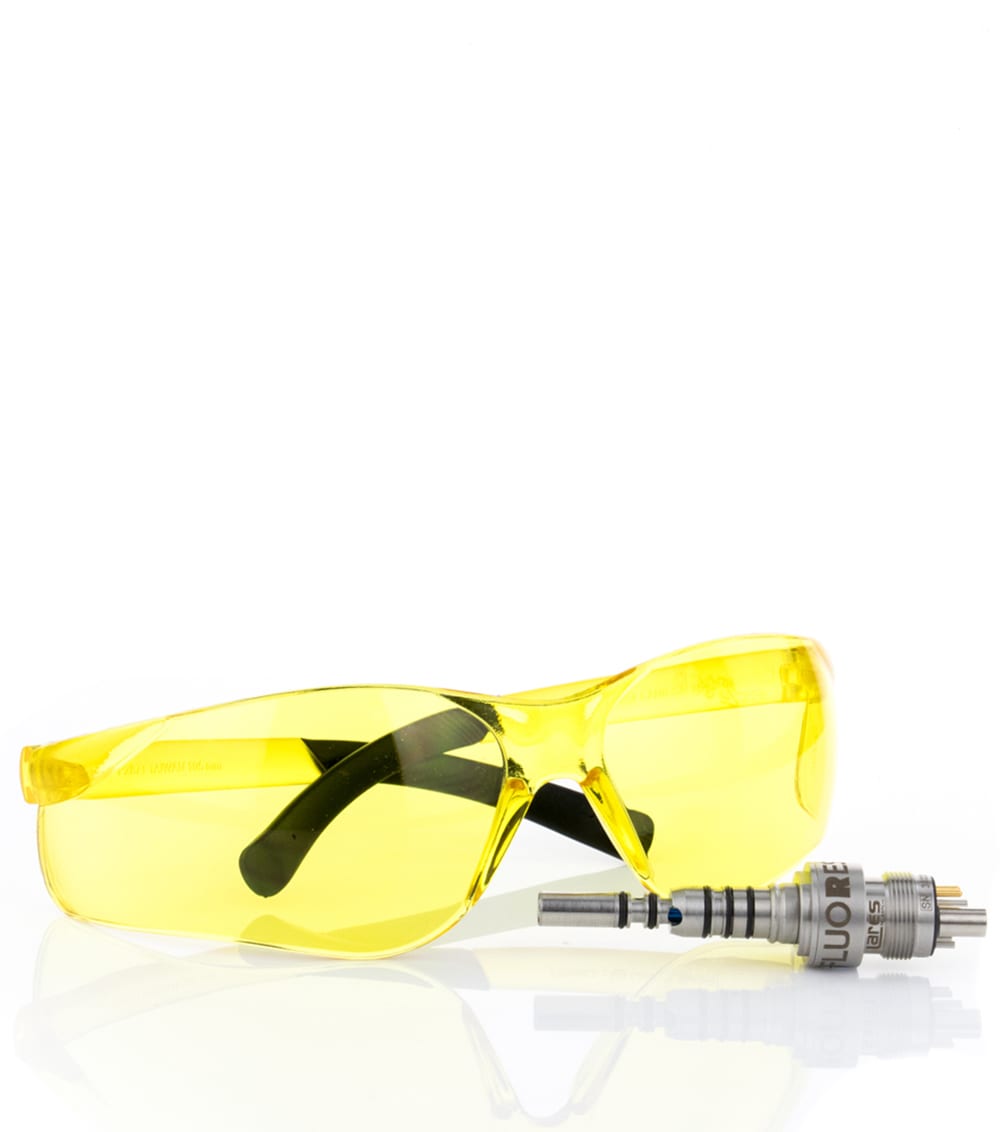• une ampoule LED qui émet une lumière à haute intensité (405 nm UV) permettant de visualiser nettement les tissus cariés en orange/rouge fluorescent grâce aux lunettes filtrantes Fluoresce HD associées.