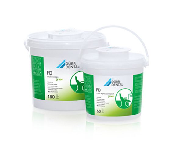 Les lingettes FD Multi Wipes Green et Compact Green Dürr Dental sont des solutions polyvalentes pour la désinfection des surfaces. Elles se présentent sous la forme de lingettes sèches, qui peuvent être imprégnées avec les solutions de désinfection de Dürr Dental. Vous bénéficiez ainsi de nombreuses possibilités pour désinfecter les surfaces tout en respectant l’environnement. Elles libèrent facilement la solution désinfectante, permettant un nettoyage complet des surfaces du cabinet. De plus, leur taille et leur matériau les rendent faciles à plier, et adaptables à toutes situations, y compris pour atteindre les petites surfaces et les recoins.