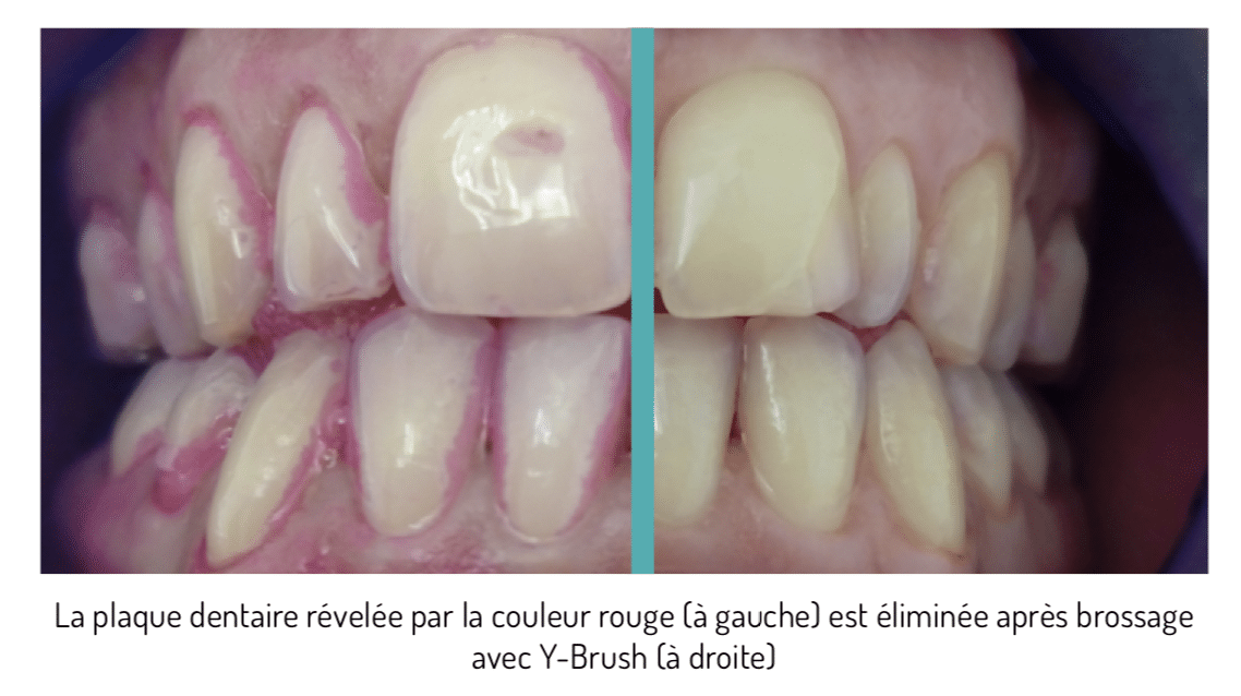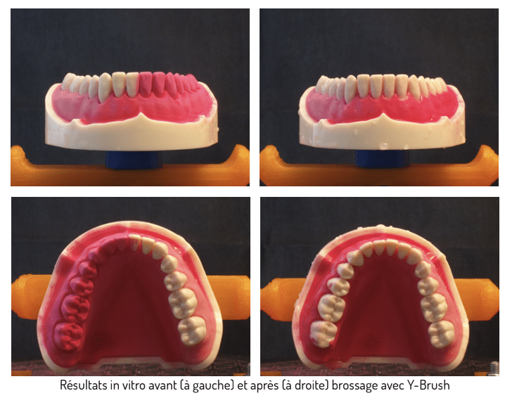 Sur les photos de gauche, la moitié de la mâchoire est teintée avec une solution colorée simulant la plaque dentaire. Les photos de droite permettent de visualiser l’action nettoyante de la brosse Y-Brush. Ces tests, réalisés pas moins de 173 fois avec 10 versions itératives du produit, ont permis d’élaborer la version définitive de la brosse dans sa configuration la plus efficace (dimensions, puissance des vibrations ultrasoniques…).