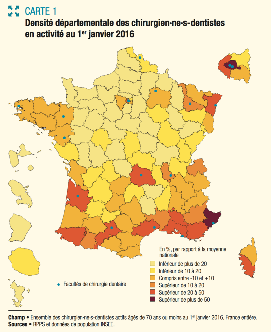 La répartition des chirurgiens-dentistes est inégale sur le territoire. Ils privilégient les départements du sud de la France. Ainsi, en 2016, certains départements sont très bien dotés, comme les Alpes-Maritimes dont la densité est supérieure de 50 % à la moyenne nationale (109 chirurgiens-dentistes pour 100 000 habitants).