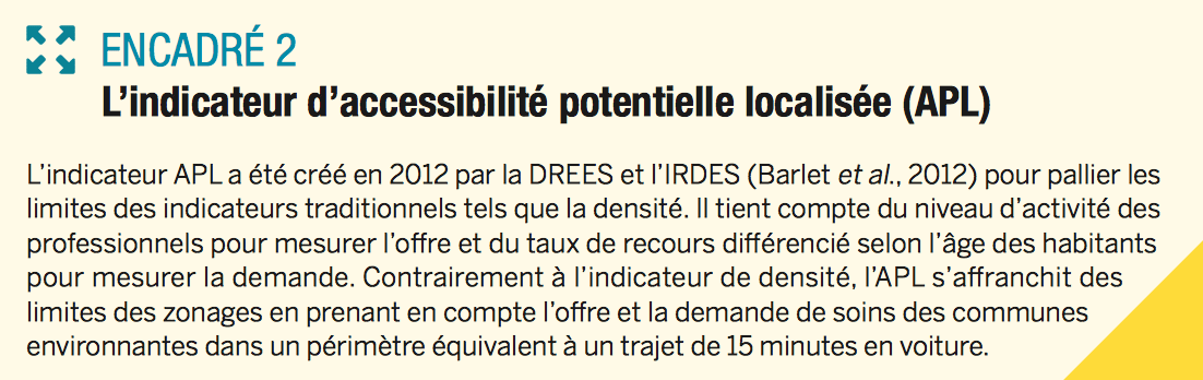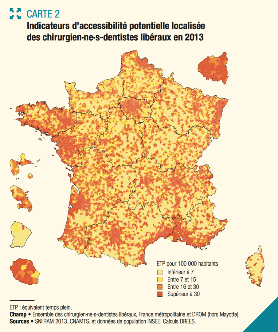 Les 10 % des habitants les mieux lotis ont une accessibilité mesurée par cet indicateur 6,3 fois supérieure à celle des 10 % des habitants les moins bien lotis (Vergier, 2016). La moitié de la population vit dans une commune où l’APL est inférieur à 46 ETP (équivalent temps plein) de chirurgiens-dentistes pour 100 000 habitants, c’est-à-dire une commune où l’APL est inférieur de 4 % à la moyenne nationale.