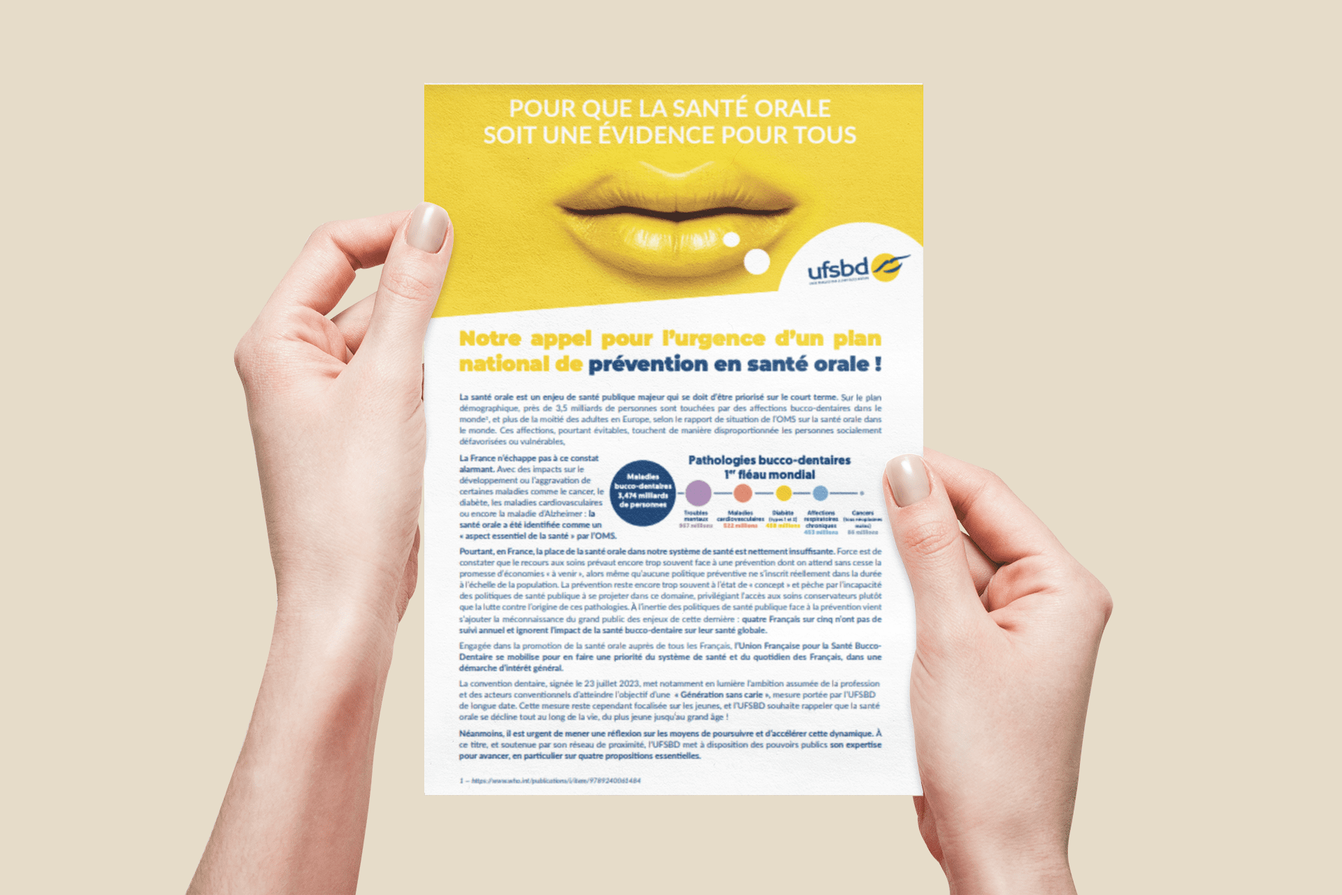 Pour l’UFSBD, il est urgent de revaloriser la santé orale en France, en la plaçant au cœur des politiques publiques et en assurant une prise en charge globale et préventive. Comme elle le souligne : « On ne peut se dire en bonne santé sans une bonne santé orale. »
