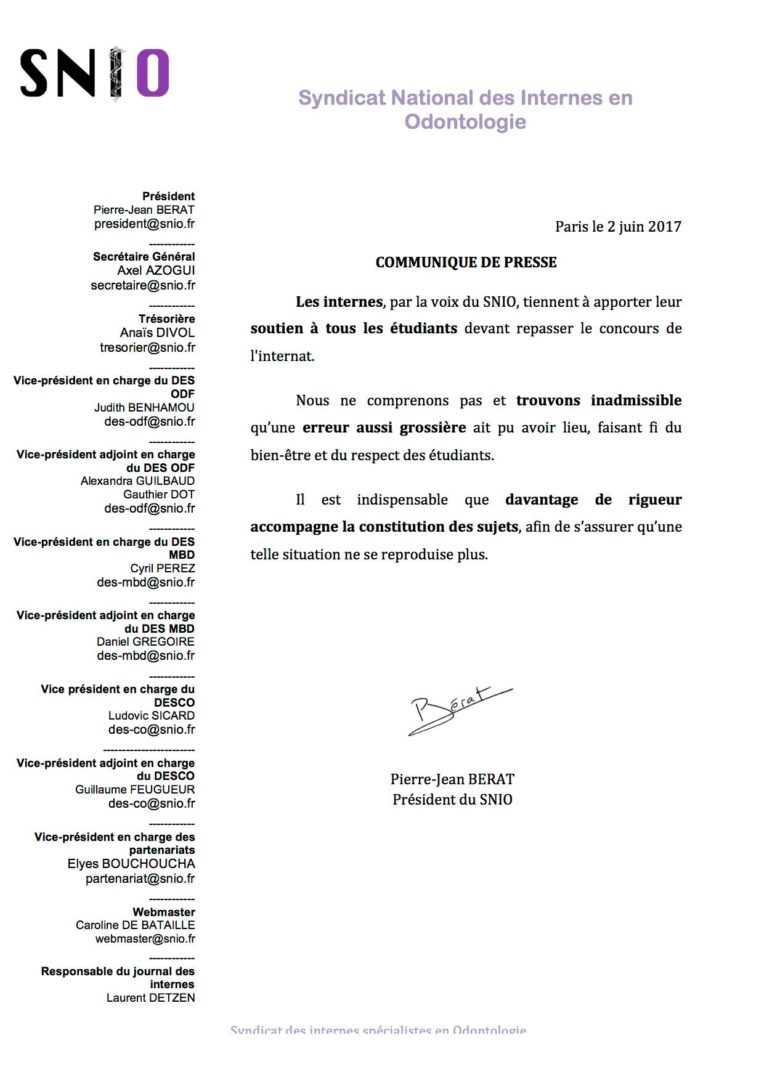 Pierre-Jean Berat, Président du SNIO (Syndicat National des internes en Odontologie) a déploré une « erreur grossière » dans un communiqué de presse du 2 juin 2017. « Nous ne comprenons pas et trouvons inadmissible qu’une erreur aussi grossière ait pu avoir lieu, faisant fi du bien-être et du respect des étudiants. Il est indispensable que davantage de rigueur accompagne la constitution des sujets afin d’assurer qu’une telle situation ne se reproduise plus.