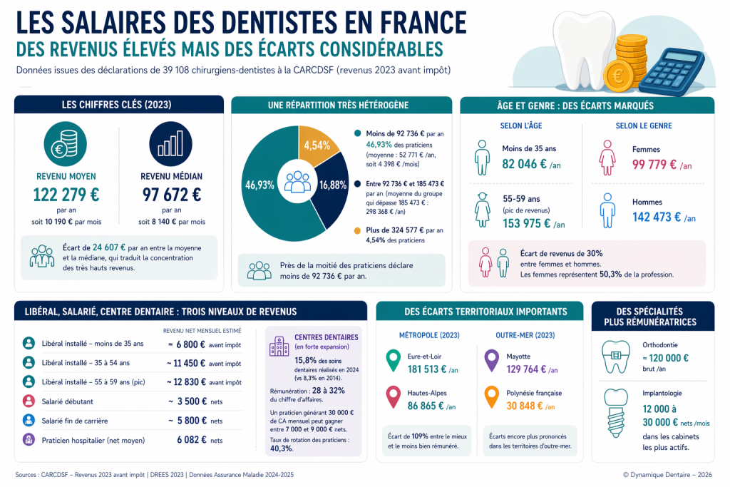 Les statistiques de la CARCDSF, fondées sur les déclarations de 39 108 praticiens, établissent le revenu annuel moyen avant impôt à 122 279 €, soit 10 190 € par mois.