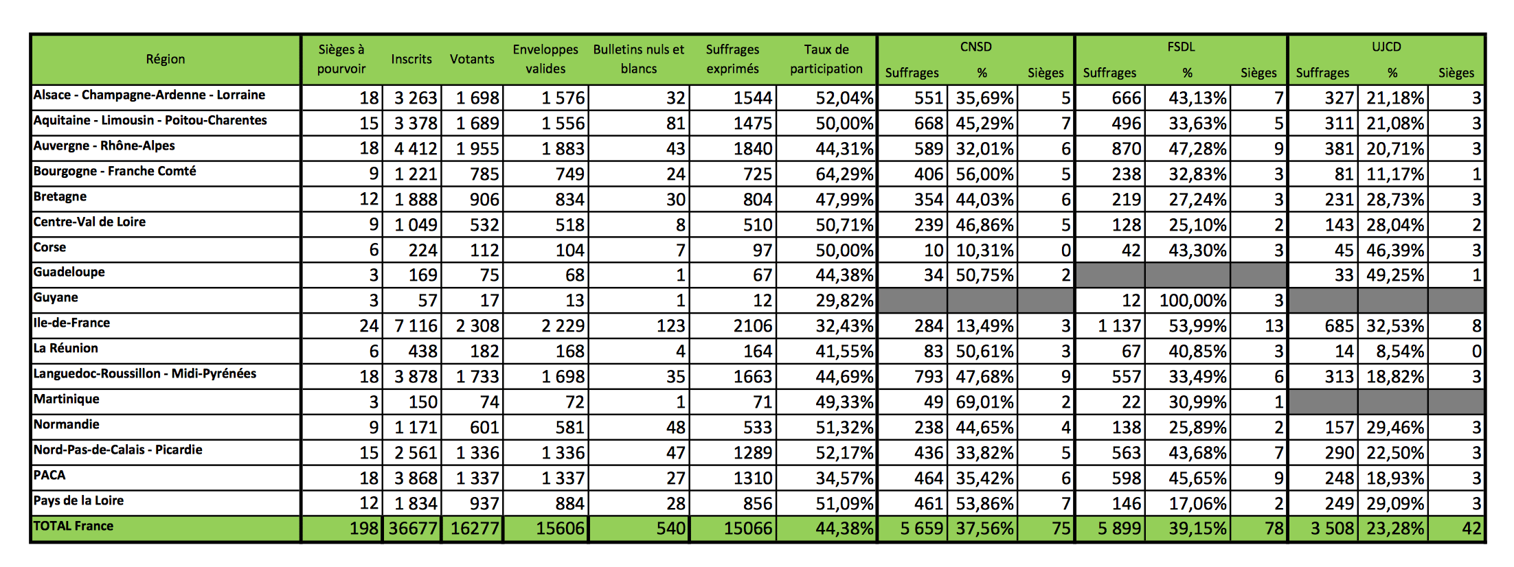 Les équilibres syndicaux se trouvent modifiés. La FSDL progresse de près de 9 points, passant de 30,22 % en 2010 à 39,15 %. Ce syndicat devient ainsi la première organisation professionnelle représentative des chirurgiens-dentistes libéraux conventionnés. La CNSD, quant à elle, perd 13,6 points, passant de 51,16 % en 2010 à 37,56 %. Enfin, l’UJCD progresse de 4,66 points, passant de 18,63 % en 2010 à 23,28 %.