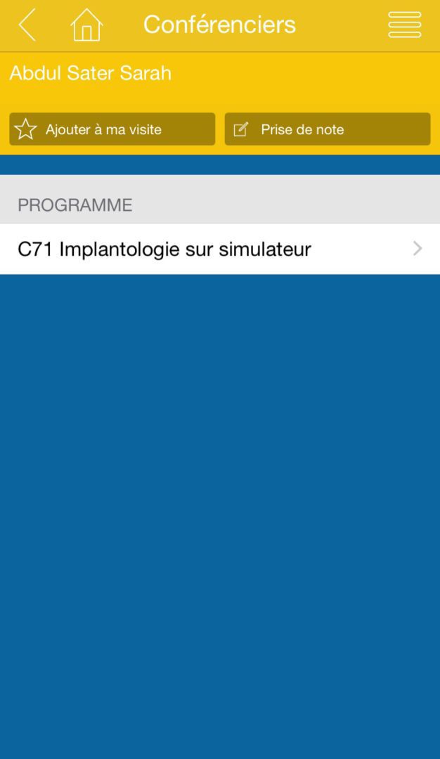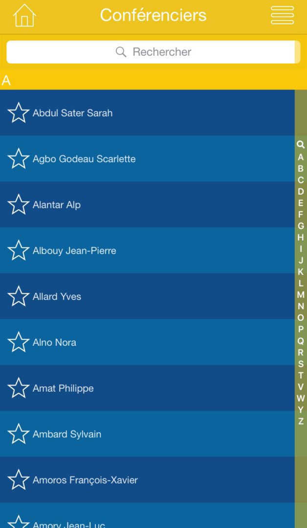 La liste des conférenciers est disponible à partir de l’application ADF par ordre alphabétique. En sélectionnant un conférencier, vous retrouvez le ou les programmes concernés par son intervention ainsi que les détails de l’évènement.