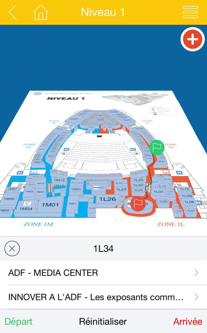 Les plans interactifs en 3D de l’application ADF permettent de se repérer sur les quatre niveaux du Palais des Congrès. Vous pouvez même afficher votre itinéraire d’un stand à un autre.