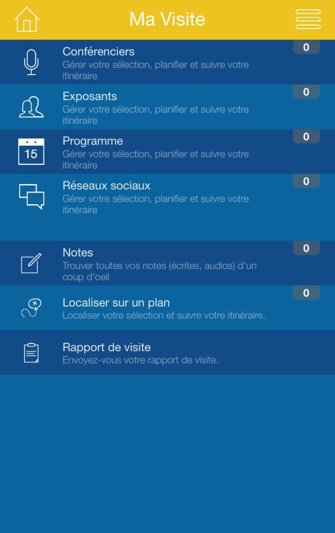 Ma visite est la rubrique personnalisable de l’application. Vous pouvez sélectionner les conférences auxquelles vous souhaitez assister, les exposants que vous avez envie de rencontrer mais aussi prendre des notes et préparer votre rapport de visite.